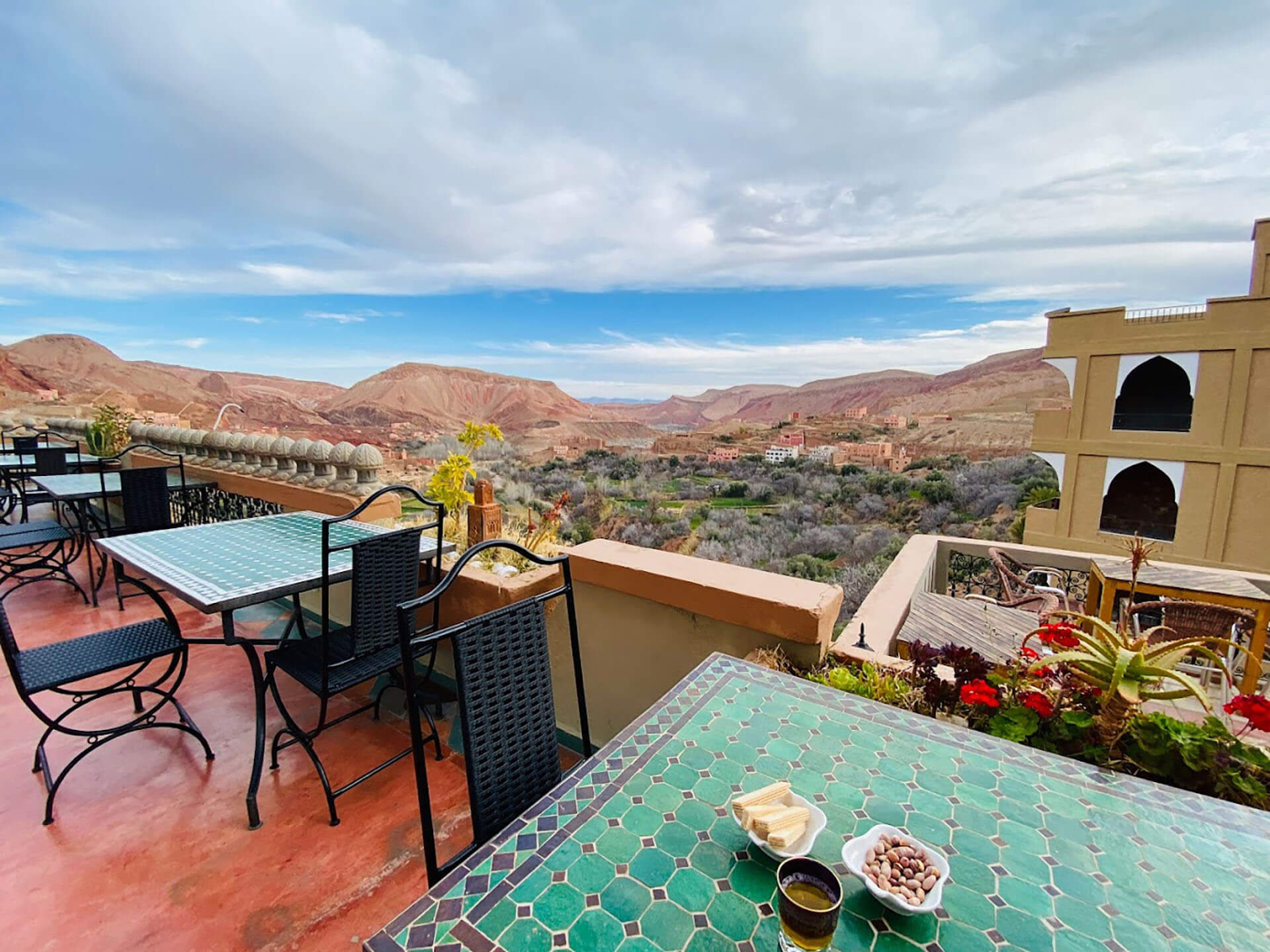 Ο δρόμος συνεχίζεται μέσω της Κοιλάδας των Ρόδων, γνωστής για τα χωράφια ροδάκινων και τις τοπικές συνεταιρισμούς που παράγουν προϊόντα με βάση το ρόδο. Τέλος, φτάνουμε στην ιδιαίτερη Κοιλάδα Dades, όπου θα κάνουμε την άφιξή μας στο κατάλυμά μας.